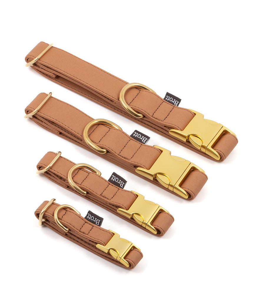 El collar para perro está confeccionado a mano en nuestro taller con un tejido que simula la piel realizado a partir del reciclaje de botellas PET dando como resultado un producto de alta calidad, muy resistente y de tacto suave. El cierre que utiliza Brott es de alta calidad en aleación de metal estando disponible en dorado mate y plateado. El collar se puede combinar con la correa para perro a juego. El collar para galgo utiliza el sistema martingale antiescape. Cuidamos de ti y del planeta. Y esto no significa que tengamos que producir cantidades innecesarias de productos. Por eso, nuestra confección es limitada, no nos gusta producir más de lo necesario. Cada compra se prepara bajo pedido, no trabajamos con stock y siempre procuramos que la distribución se haga de la manera más efectiva. Cuidamos del medio ambiente ¿cómo? Acompañando todos los accesorios en un packaging de cartón, bolsa de tela o papel y así reducir la huella en el medio ambiente.
